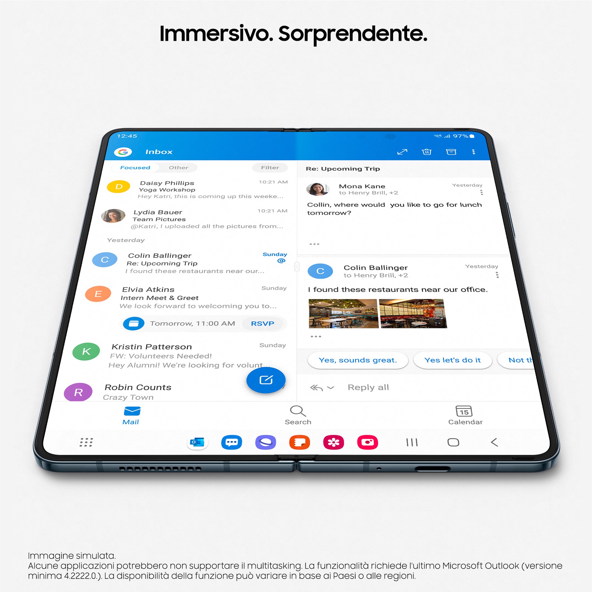 Svolgi le tue attività con pochi semplici tocchi sul display principale da 7,6”1 di Galaxy Z Fold4: per navigare e passare da una finestra all’altra più rapidamente, puoi facilmente aggiungere le app alla barra delle applicazioni.2 In più, la funzionalità Unisci App ti consente di aprire contemporaneamente fino a tre app all’interno di uno stesso display.3
