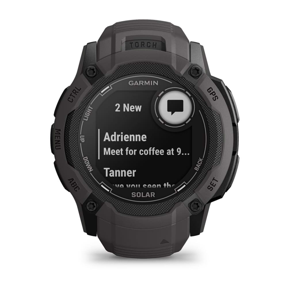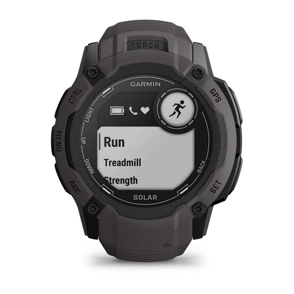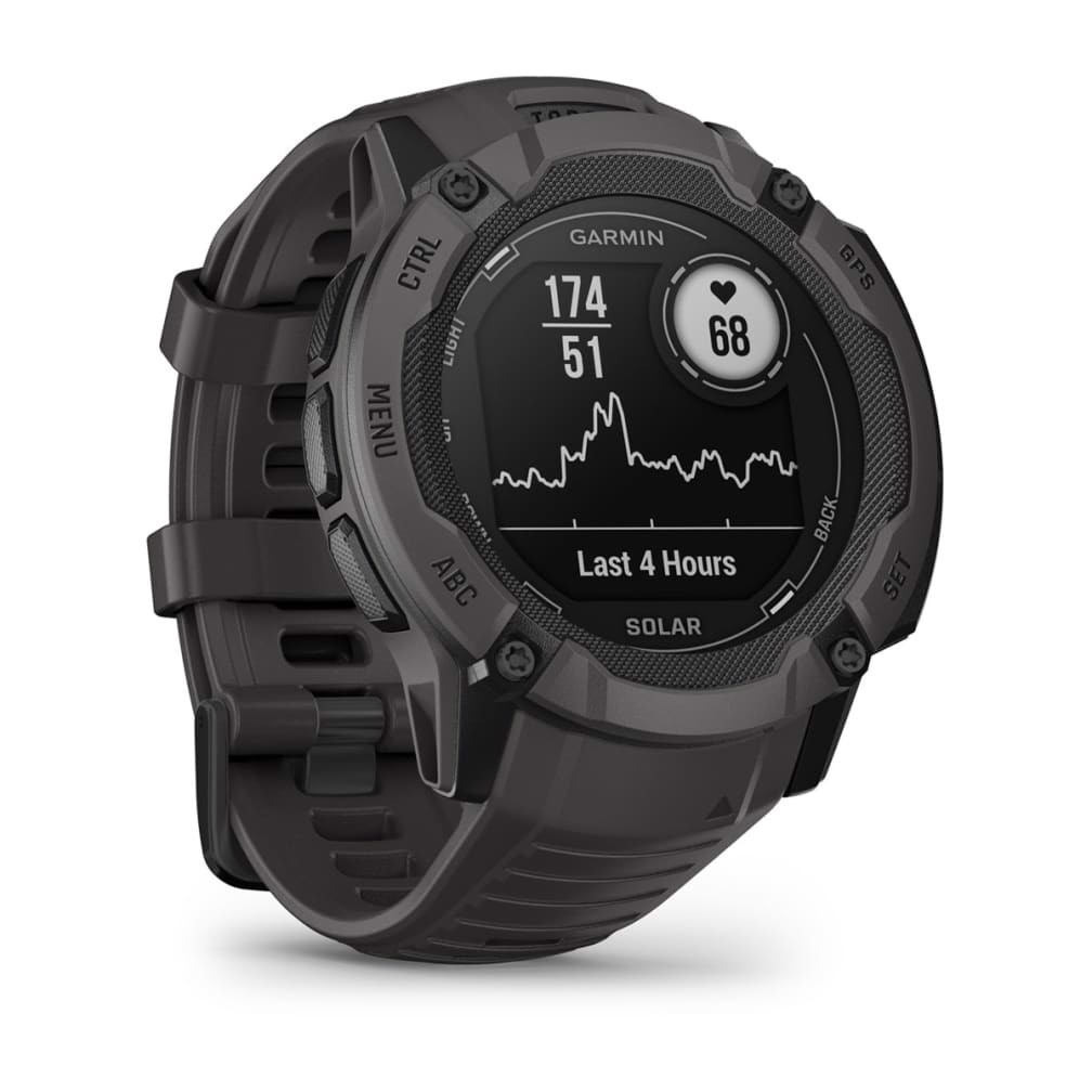 Garmin Instinct 2X Solar. Dimensioni schermo: 2,79 cm (1.1"), Tecnologia display: MIP, Risoluzione del display: 176 x 176 Pixel, Touch screen. GPS (satellitare). Peso: 67 g. Materiale cinturino: Silicone, Colore cinturino: Grafite, Dimensione del cinturino: Taglia unica