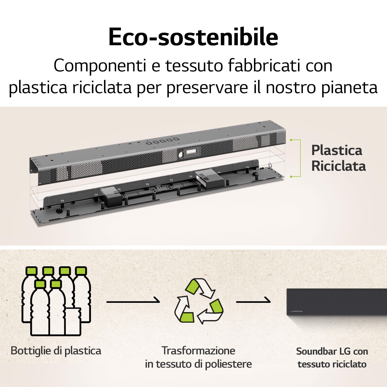 Design e materiali eco-sostenibili rispettosi dell'ambiente S75Q è certificata "ECO PRODUCT" poichè viene assemblata in parte con materiali riciclati da tessuti e resine riciclate.Il packaging è ricavato al 100% dalla carta ed è a forma di "L" per occupare meno spazio in logistica e quindi diminuire le emissioni inquinanti nel trasporto.Tutte le soundbar LG sono certificate "Energy Star" per un consumo ecologico a bassa potenza.