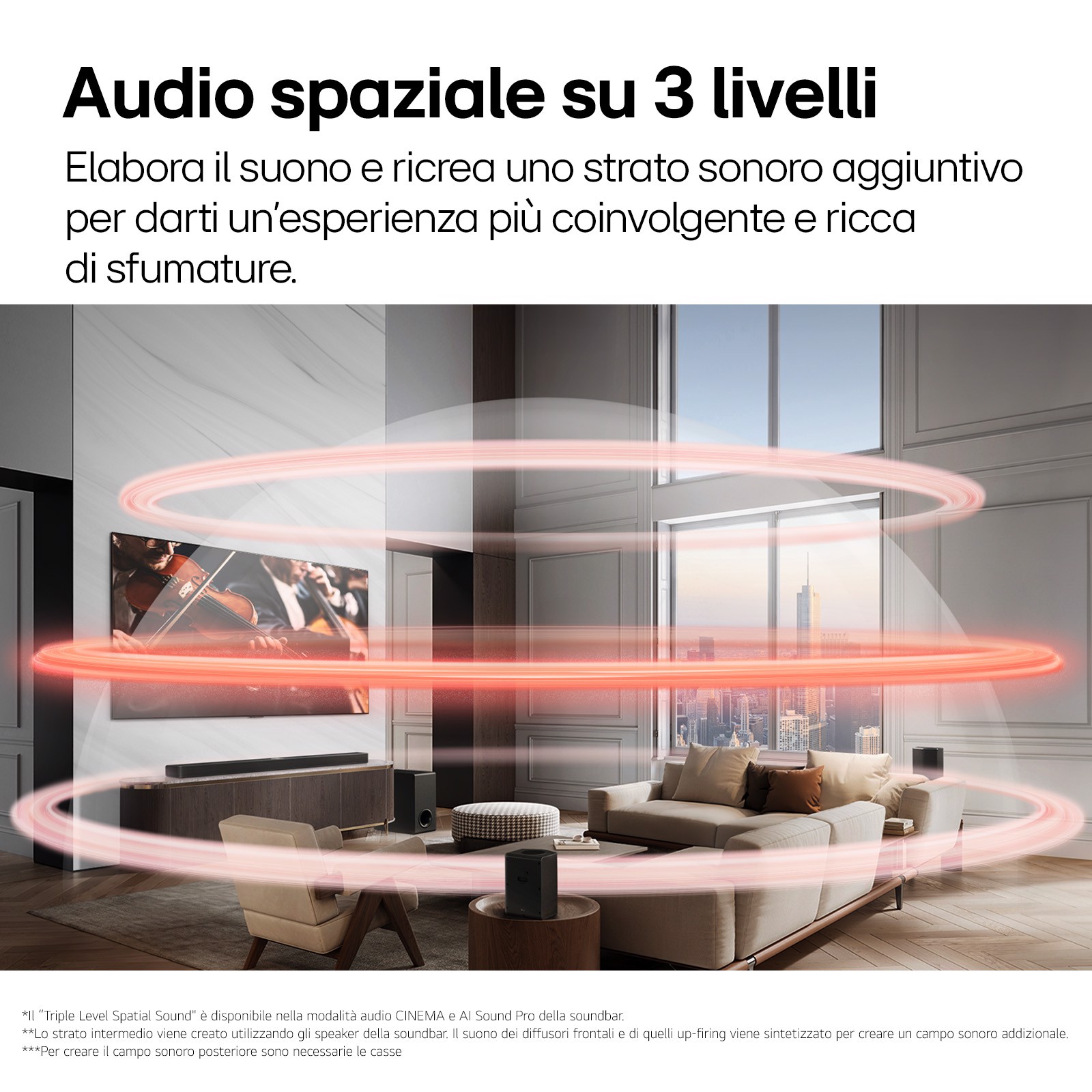 Se hai un TV LG (modello dal 2023 in avanti) l'audio del TV e della soundbar lavorano in sinergia per offrirti una resa sonora ancora più coinvolgente. Il TV si focalizzerà sulle frequenze alte e medie, mentre la soundbar su quelle medie e basse. Il risultato sarà un suono ancora più ricco per un palcoscenico sonoro più coinvolgente.