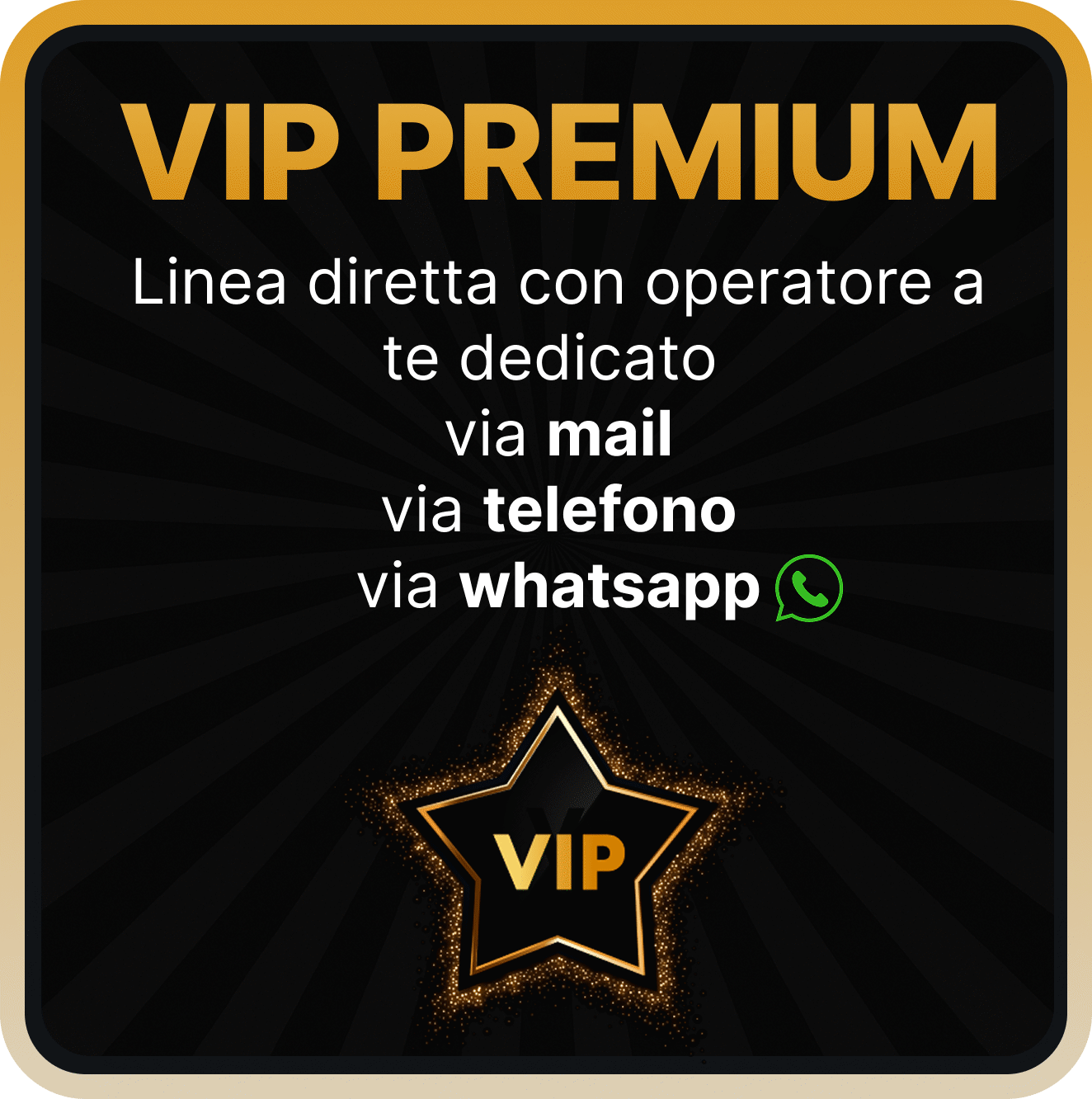 Hai bisogno di aiuto? Con il nostro servizio VIP avrai a tua disposizione un codice di accesso per parlare con un operatore a te dedicato lun-ven 10-12 / 15-19.