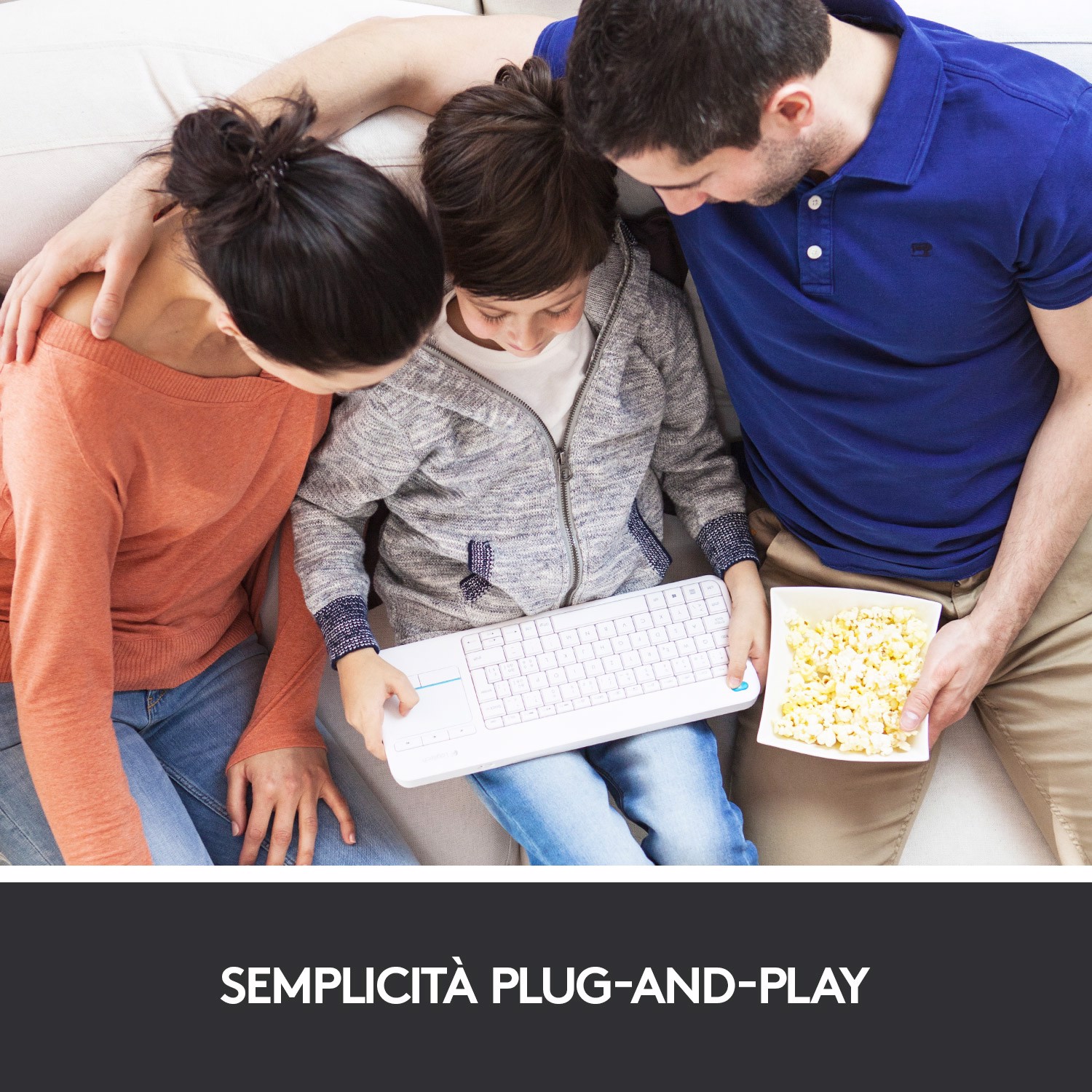 La tastiera wireless con touchpad Logitech® K400 Plus consente di controllare in tutta comodità la TV connessa al computer. Guarda video, esplora il Web, chatta con gli amici e molto altro senza alzarti dal divano. La tastiera completa con touchpad elimina i problemi relativi al dispositivo, mentre il raggio d'azione wireless di 10 metri (33 piedi)¹ garantisce accesso ininterrotto al tuo intrattenimento preferito da PC a TV. 1 Il raggio d'azione wireless può variare in base al sistema operativo e alle impostazioni del computer.