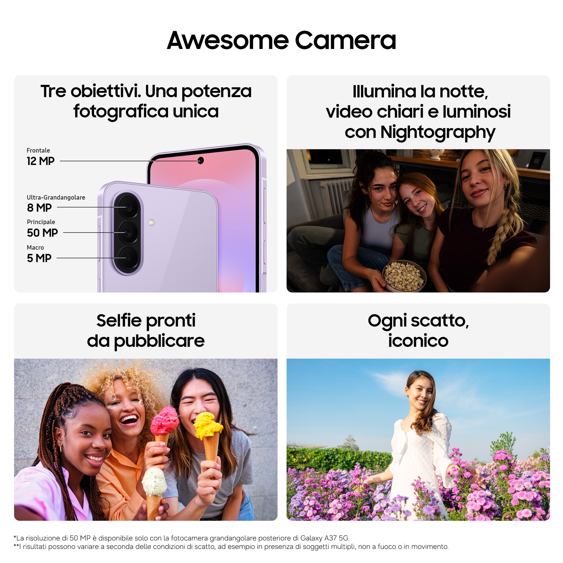 Samsung Galaxy A37 5G. Dimensioni diagonale schermo: 17 cm (6.7"), Risoluzione del display: 1080 x 2340 Pixel. Famiglia processore: Samsung Exynos, Modello del processore: 1480. Capacità della RAM: 6 GB, Capacità memoria interna: 128 GB. Risoluzione fotocamera posteriore (numerico): 50 MP, Tipo di fotocamera posteriore: Tripla fotocamera. Capacità della scheda SIM: Doppia SIM. Sistema operativo incluso: Android 16.0. Capacità della batteria: 5000 mAh. Colore del prodotto: Grigio. Peso: 196 g