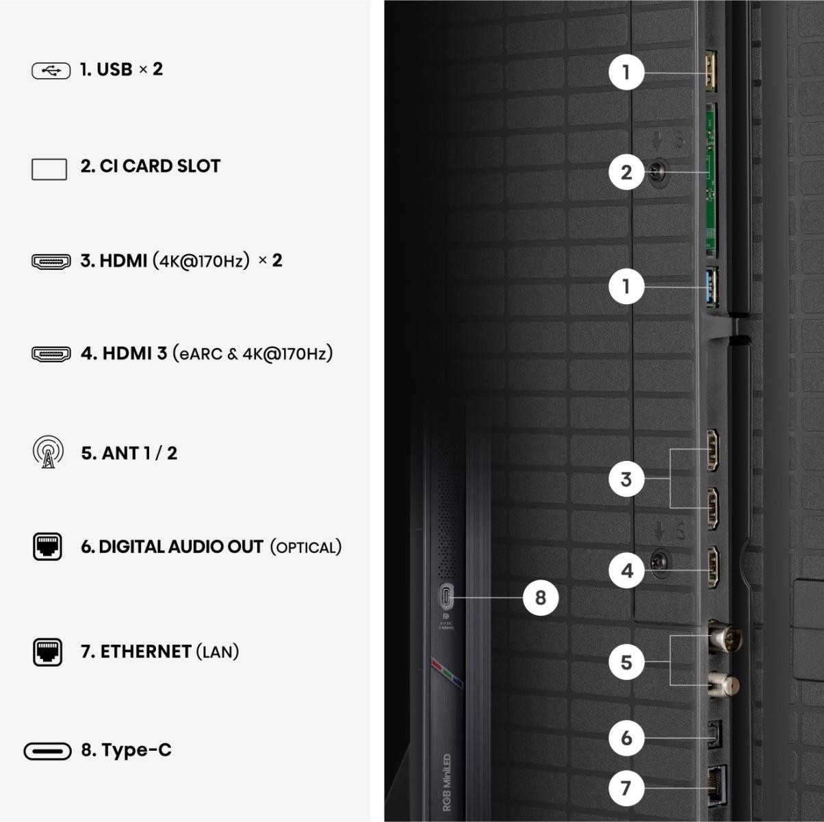 Hisense 65UR9S. Dimensioni diagonale schermo: 165,1 cm (65"), Risoluzione del display: 3840 x 2160 Pixel, Tipologia HD: 4K Ultra HD, Tecnologia display: LED, Forma dello schermo: Piatto, Tipo di retroilluminazione LED: RGB-Mini LED. Smart TV. Luminosità schermo: 3500 cd/m², Tempo di risposta: 6 ms, Rapporto di contrasto: 8000:1, Rapporto d'aspetto nativo: 16:9. Formato del segnale digitale: DVB-T, DVB-T2, DVB-S, DVB-S2, DVB-C. Wi-Fi, Collegamento ethernet LAN. Colore del prodotto: Grigio