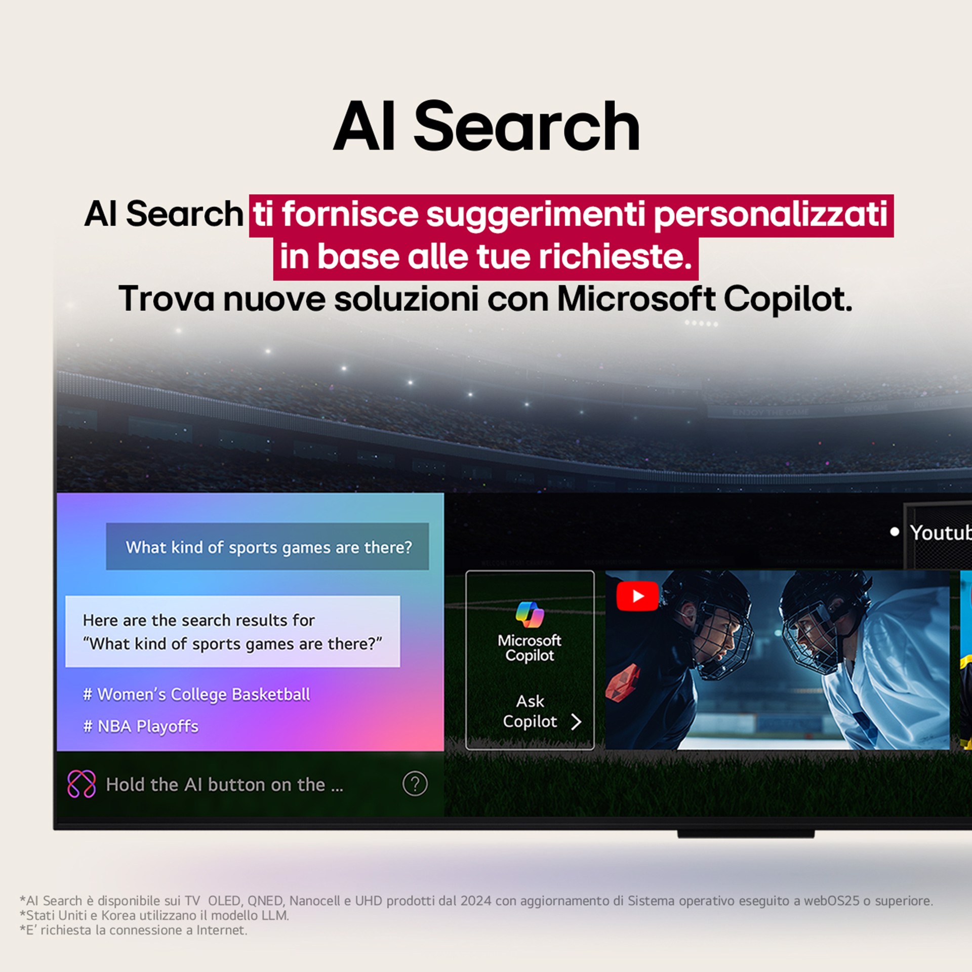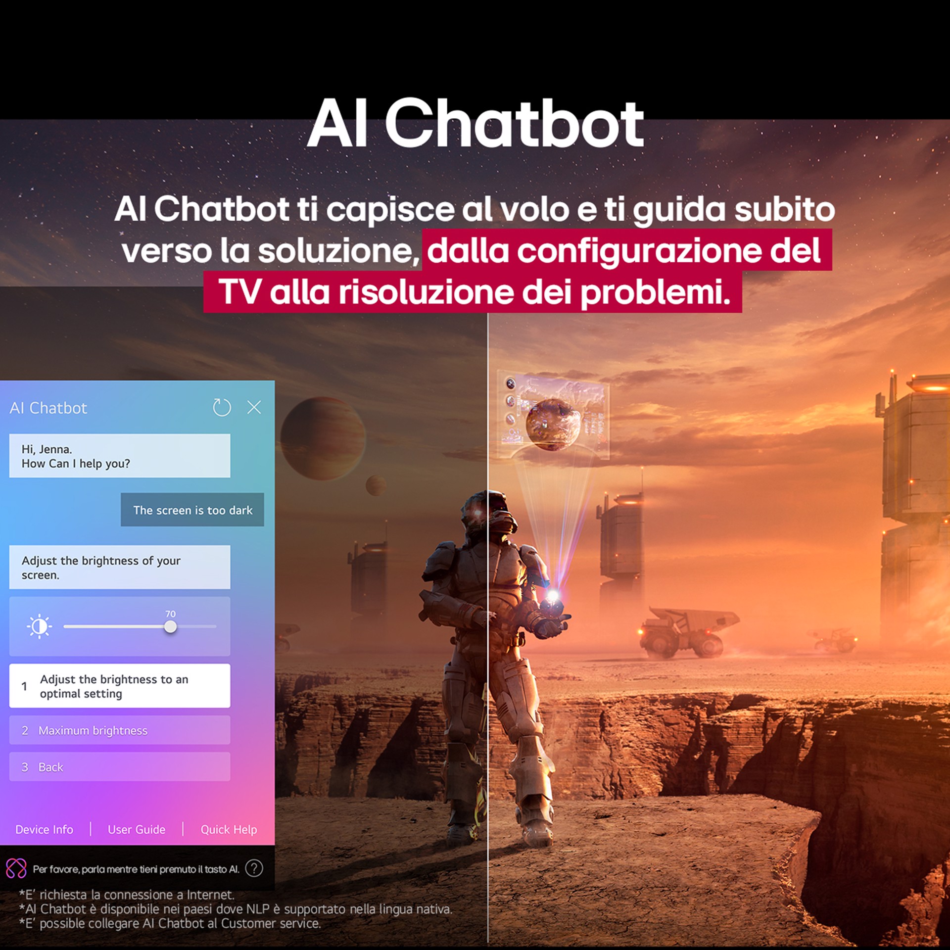 Quando accendi il TV, riconosce automaticamente la tua voce e imposta il tuo profilo per darti un'esperienza personalizzata. Ad esempio, ti consiglia nuovi contenuti da guardare in base alla tua cronologia di visione, imposta la schermata principale con le app che usi di più e ti suggerisce le parole chiave da usare per scoprire nuove funzioni.